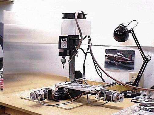 If you've ever seen a Sherline mill before, you were probably wondering what that goofy looking thing over the motor was. Since I mill 3 parts at a time, and a good portion of the 2.1 hours it takes is cutting pockets with a 3/8" end mill, I was having problems with the drill motor overheating. The bad part of the overheating was that the electronic control circuitry for the DC motor would shut the motor off!! You guessed it, the CNC gear would continue to move the table. Not good! Rather than slow the cutting rate down (!) I went to the local Radio Shack and purchased a 65 CFM muffin fan. Next, I made a bracket out of 3/4" angle aluminum to hold the fan right above the motor. The fan actually sits right on the top of the motor and the top of the motor support the center of the fan. It works amazingly well at keeping the temps down. I noticed that a lot of the air from the fan wasn't really blowing on the motor, so I made that really sexy shroud out of some .032 sheet aluminum. Now the motor runs only slightly warm even towards the end of a 3 piece run!