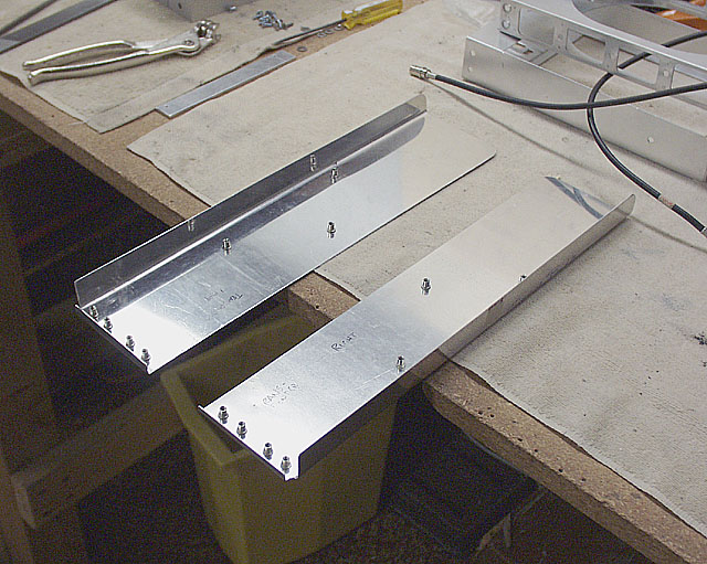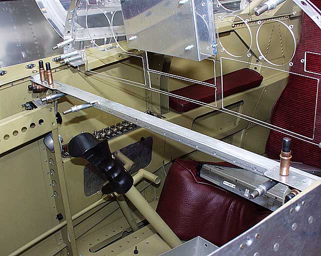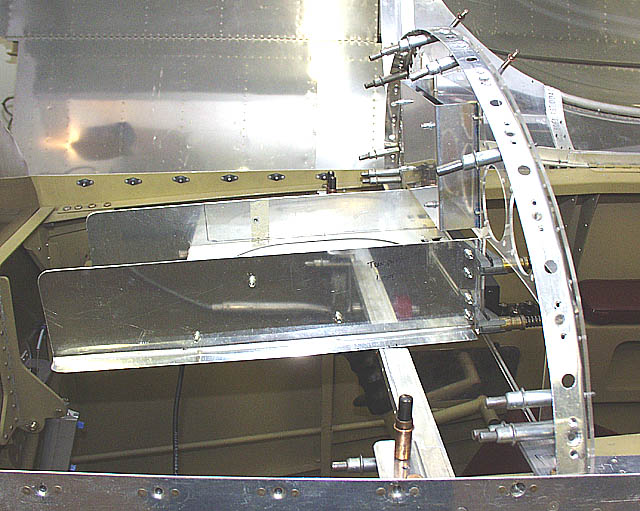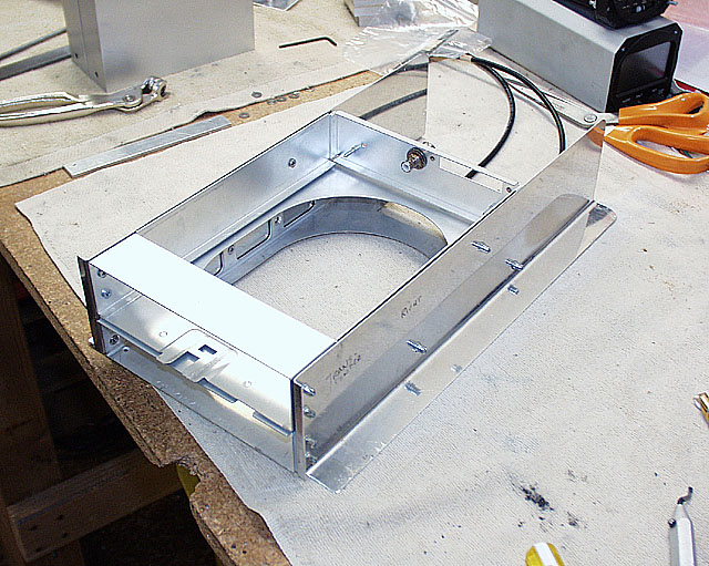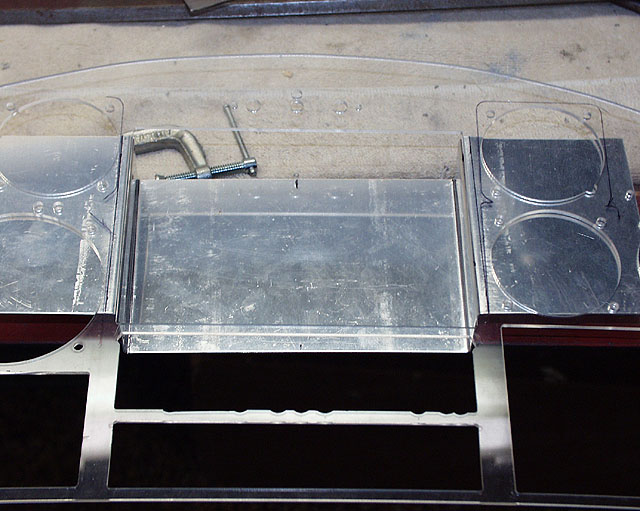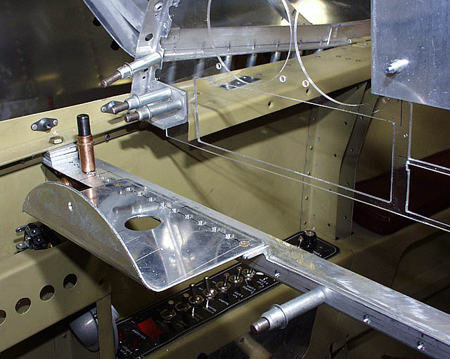 I had to modify my support bracket behind the instrument panel for a second time with the new layout because I had placed the radios so low in the panel. I had already modified this bulkhead on the previous version of the instrument panel, replacing the .032 bent sheet with a single piece of .75 angle. This served two purposes. The first was to increase my knee room by over 2". With my feet on the rudder peddles, the tops of my knees bang right on the bottom of this bulkhead; certainly not the most comfortable position. The second reason for switching to the .75" angle was to build in something strong in which I could support the weight of the radios. This new piece worked out well satisfying both requirements. I did find I had to modify it for this new panel, though.
