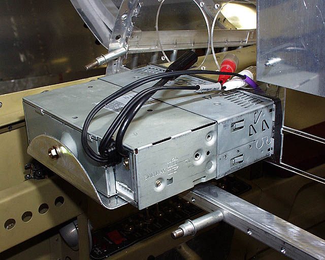 I cut out a deep .25" right out of the top of the angle to allow the radios to fit down correctly and assure that the angle of the instrument panel and the radios was correct. Cutting the piece out left my sturdy support pretty weak though. I added another angle facing the other direction and cutoff .25" of its bottom. Strength restored, knee clearance maintained! The photos here show the replacement bulkhead, and supports for CD Changer, uMonitor, Radios, and GPS. Note that I had to move the Intercom to the right to make room for the ELT panel I had forgotten on the first CAD layout. Yeah, was I glad this was just the Plexiglas mockup!!