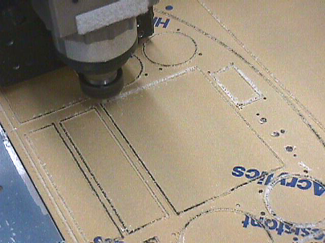 When I was sure everything was just right, I generated a DXF export file of my new Version 2 CAD drawing and emailed it off to Steve Davis of The Panel Pilot. Two days later I received an email from Steve telling me that my Plexiglas Mockup #2 had been cut and was shipping out the next day. He included the "CNC Cutting" photos on the right showing just how my Plexiglas panel was cut on his Gantry CNC Milling Machine. Very cool. When I look at these photos my mouth hangs open as I recall how I labored for days cutting my first two instrument panels with about 50 Dremel Cutting wheels and some dull files. Not only is it a lot easier to sit at my computer and layout my panel in a CAD program than it is to cut all that metal by hand, but the end product is far more accurate, straight, and well, just plain awesome looking! :-)