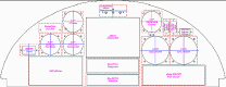 I used a program for Windows call Micrografx Designer to layout the panel. It is a full-featureed graphics CAD program that has everything you need to create very accurate drawings and export AutoCad DXF files. Using a micrometer, I measured the exact dimensions of each instrument and proceeded to draw a replica of the instrument in the CAD program. Areas that were to be cutout and did in black, bezel outlines in red, and description text in purple. After I was satisfied with the layout of a given instrument, I used the "Group" function on it so that I could then drag it around on the virtual panel as a single entity.