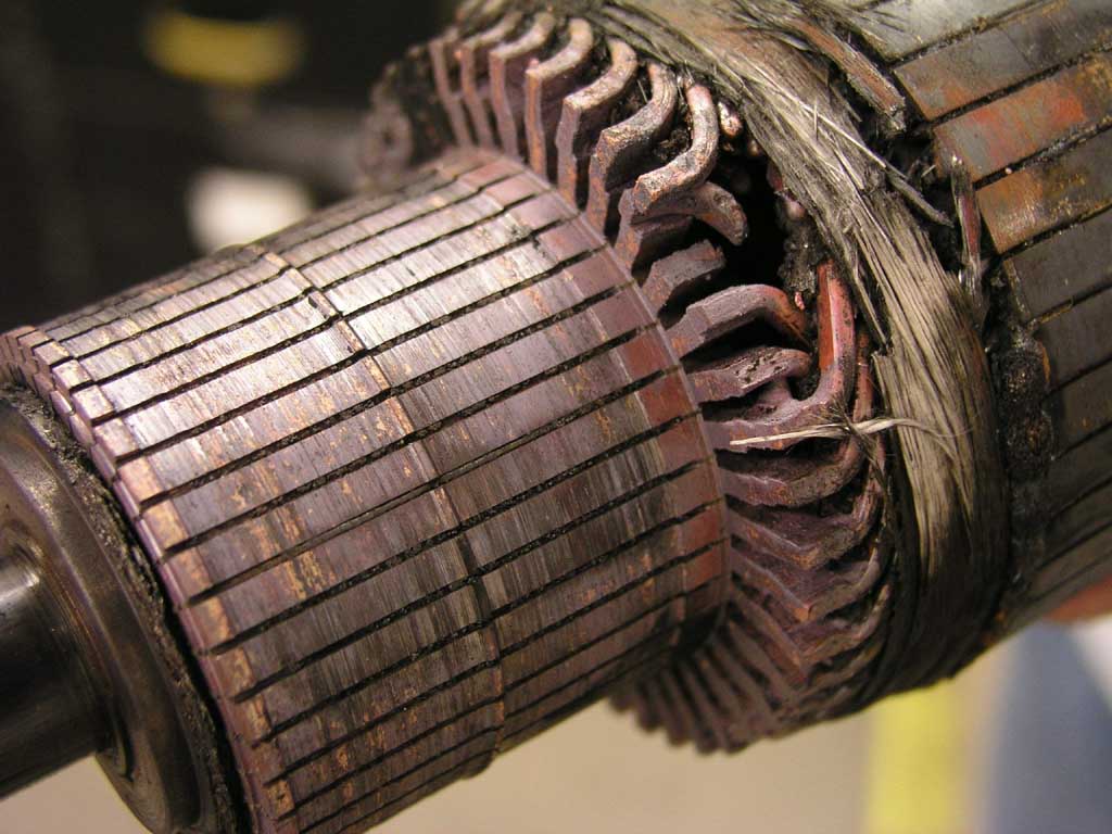 Alternators in various forms have been the engine driven power sources of choice for a variety of earth and airborne vehicles since the 1950's. They don't mind being belted to run fast so one does not give up service life by choosing pulley ratios that produce useful electrical output even at low engine speeds. Generators had major service life problems with brushes sliding over slotted commutators. The problem was exacerbated by the fact that brushes had to carry the machine's full output current. This photo illustrates the potential for destruction of an exemplar 400A generator's commutator where brushes routinely carry 300+ amps in flight and 1500 amps tapering to 300 amps over 20 seconds each time the engine is started. |