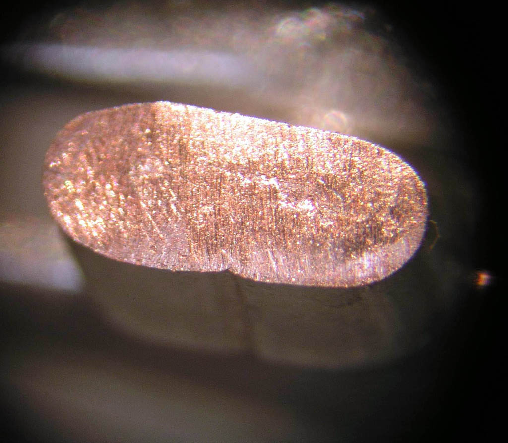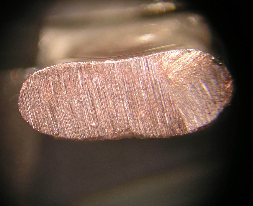 for the task at hand . . . but I think the idea is clear. Note that there are no voids in the wire grip area for either terminal. If I had a better polishing tool, you would be able to see individual strands captured in the terminal wire grip barrel. The 500 microinch or so thickness of tin plating on each strand would be visible as squashed ovals traced in the copper surface. I'll try to get some terminals properly polished and replace these photos with some that show this level of detail. Bottom line is that both tools produce volume within the finished crimp that has become a single solid mass with no voids. |
