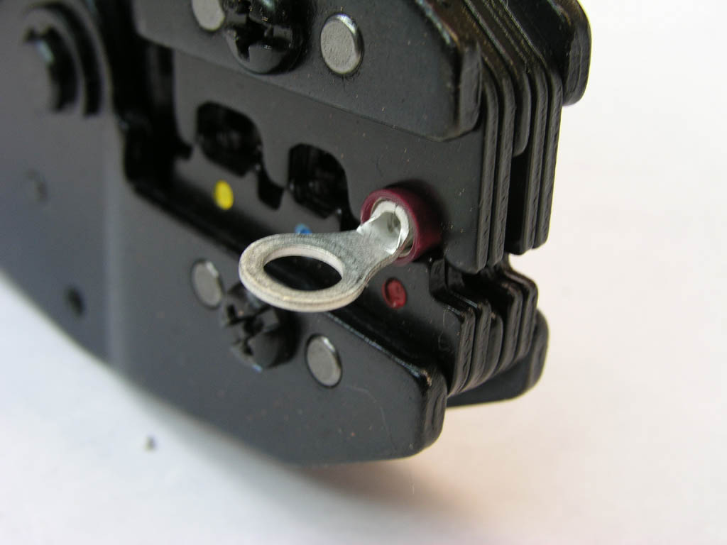 just flush with the end of the terminal at crimp time. For the El-Cheapo, just center the plastic barrel in the jaws and orient the terminal flag parallel to the plane of the crimp. Closing the tool down to the first "click" will capture the terminal in proper position. You have to watch the free end of the terminal during wire insertion so that exposed strands are just flush with the end of the wire grip. |