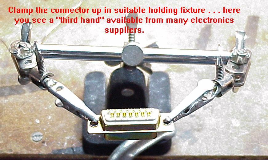 Step 1 . . .Tools needed: (1) Some means for holding the connector while you work on it. (2) A soldering iron with a 1/16" or smaller tip . . . wattage not terribly critical but it needs to be hot enough to melt the tip of a strand of solder in one second or so. 40W is certainly enough, many 25W irons will do. We're looking for a 650+ degree iron. (3) Heat gun if you're going to finish the joints with heatshrink. (4) Wire cutters and strippers. Materials needed: (1) 63/37 alloy, 0.032" or similar small size solder. I like Kester Resin 44 but there are several good ones. (2) Heat shrink tubing (optional). If you plan to install a backshell on the connector, the heatshrink is not necessary. For installations in tight quarters, you can usually get by with no backshell if the wires get a fairly stiff heatshrink jacket like our S817C3 heatshrink. |
