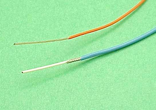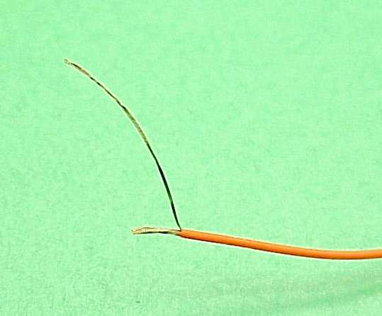 The goal is make a compact electrical connection to the shield braid with a short piece of small wire. 22AWG is about the largest you want to use, 24 AWG is the smallest. Strip off approx 1" of insulation from from your pigtail stock as shown.