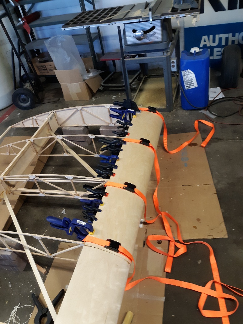 I braved the heat in the shop. The third Plywood panel is cut and strapped in place