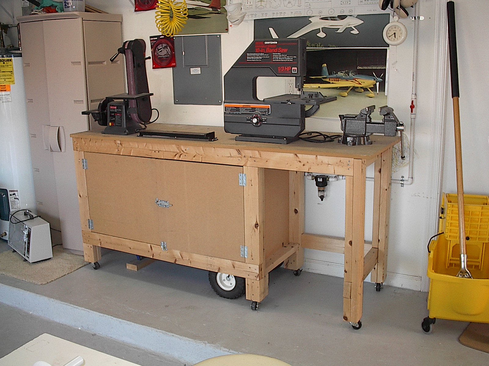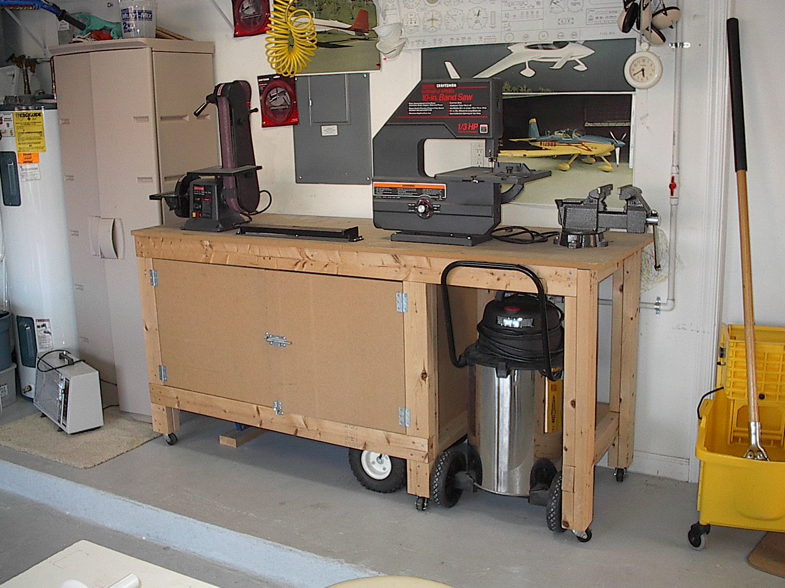 Subject: Compressor-Tool Bench Description: In an attempt to maximize every square inch of my shop, I decided that I couldn't have my compressor just sitting there occupying space. So, I decided to build a movable bench on top of it. This way the compressor could be accessed with ease and the bench could be used to hold my most used tools. Since the bench would be on wheels, I could easily move it anywhere in the garage without touching the compressor. The bench to houses my 2" belt sander, 16" bending brake, band saw and vise. Additionally, I built a Shop Vac garage in it to get it out of the way when not in used.