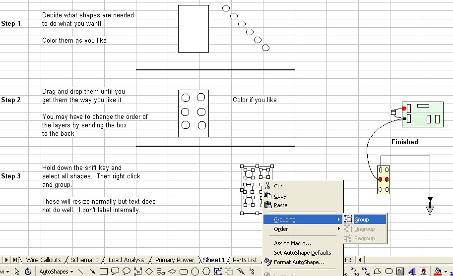 Subject: How to build custom connecting shapes (parts) for schematics in Excel Description: Excel can work pretty nicely for a wiring schematic if you use the connecting lines features so that shapes move with the attached wires as you add pieces. I put a couple of screen shots up earlier on how to use connecting lines and the flow chart functions and thought that maybe a quickie on how to make custom shapes that look like real parts would be handy. Jeff reminded me that you can group shapes to make custom parts that look like whatever you choose.