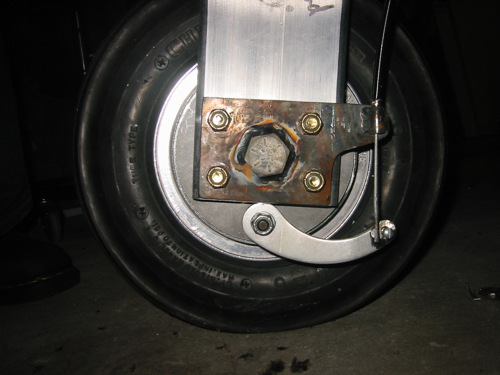 Subject: Azusa Mechanical Brakes Description: First three photos are of my rudder pedal modifications for the use of brake cables for the Azusa mechanical brakes. I used leftover 4130 for all modifications. The fourth picture is of the modified torque plate installed on my homemade spring gear. The last picture is of my gear. Please e-mail me with specific questions.