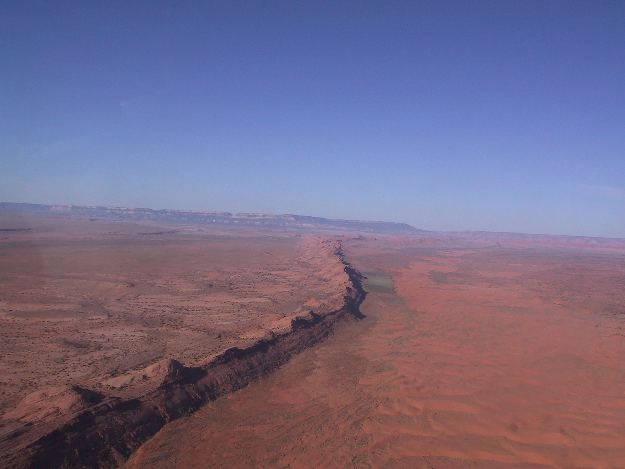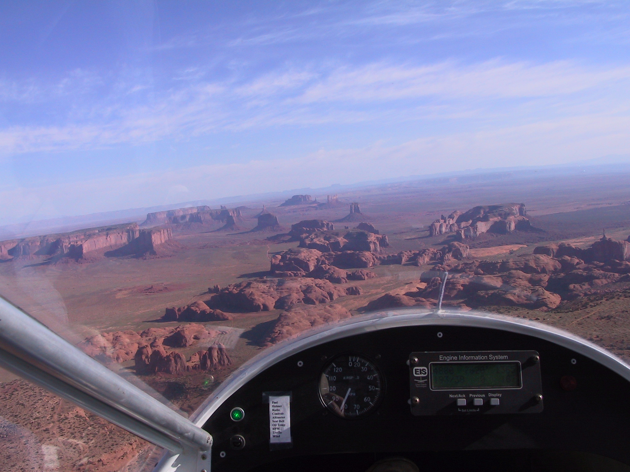 129-2932_IMG.jpg Sand dunes and a very lonesome curving ridgeline at the south end of the valley. 129-2935_IMG.jpg Good airspeed, no flashing red light on the EIS, and not a bad view. 129-2937_IMG.jpg The heart of Monument Valley. "The Totem" is visible as a thin toothpick near the center of the photo. 129-2947_IMG.jpg The most dramatic example of folded rock layers I have ever seen. This is from the Mexican Hat area, about 30 miles north of Monument Valley. The air was rough, so I grabbed a few photos and headed right back to MV.
