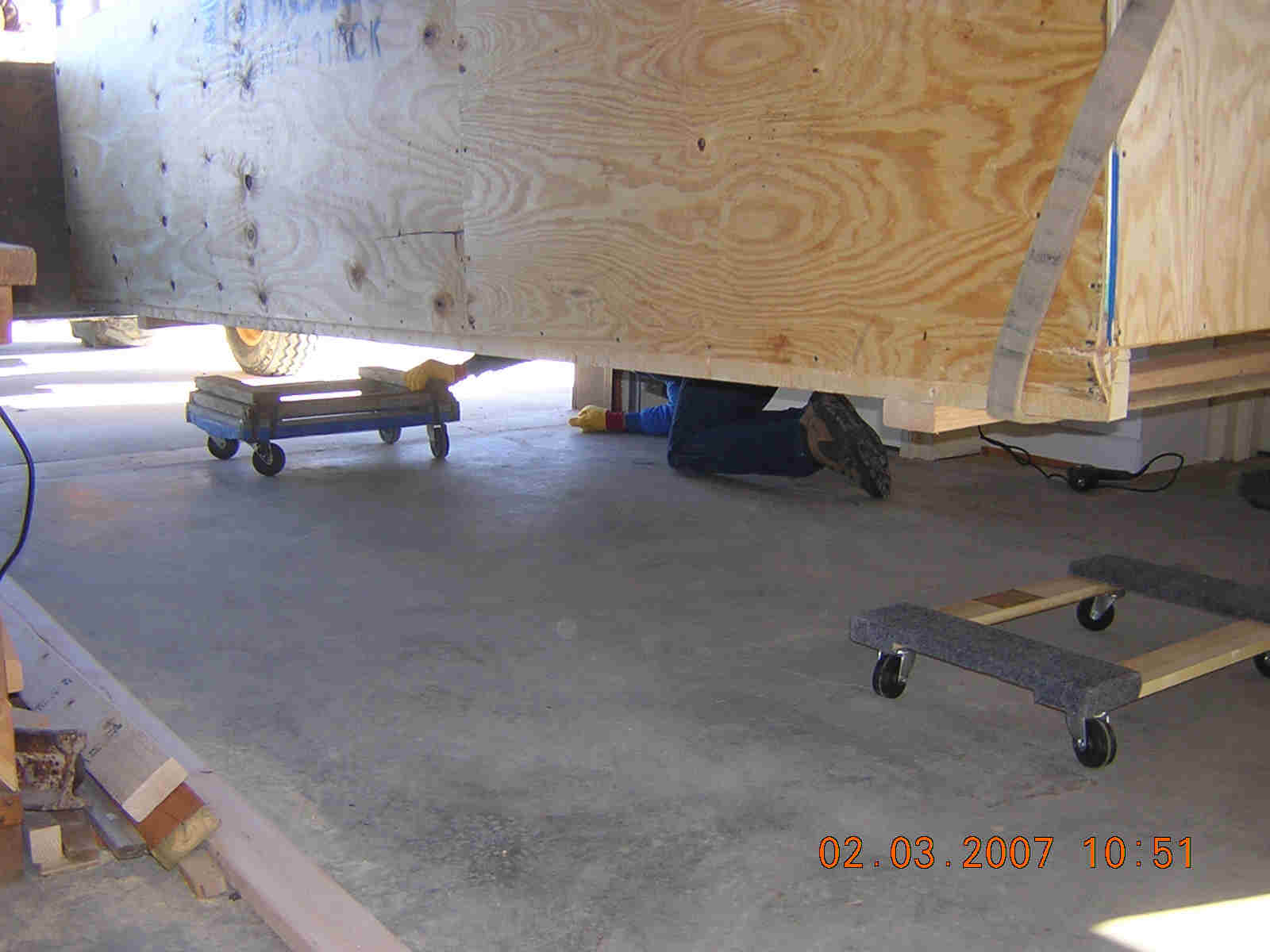 At my place, Mel plucked it off the trailer with straps and his back hoe bucket as shown in the attached photos. The guy is an artist with a backhoe--what more can I say. I couldn't recommend his method, but it worked for me. I had visions of a crumpled crate full of thousands of dollars worth of crumpled aluminum. I haven't calculated the compressive force on the 900 lbs crate, but it had to be a lot. He just drove the crate into the garage and set it down on two furniture dollies with 2x4x4's laid across to distribute the load.