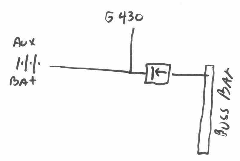 I'm looking to put a second battery in my RV for backup, in case of alternator failure, but also to pickup clearances at busy airports, prior to engine start. I have already wired the panel but, wondered if I could just use a diode in the power line coming off the buss so the aux battery could be charged, but not power the whole system, when I'm using the radio for clearances. See crude diagram below.