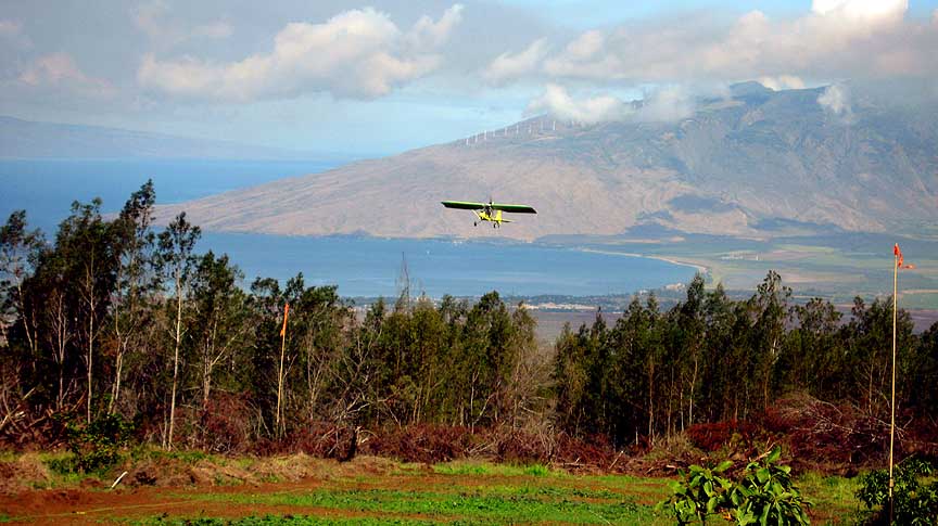 Pueo Field has been carved out of a sloping forest 2,700 ft. up the side of Haleakala (10,000 ft.). It uses the "Air America" lay out... take-off downhill (runway 29), land uphill (runway 11). I've paced out 350 ft. of lumpy hillside runway, 50ft. wide at the bottom down to 30 ft. at the top. The trees that surround it are about 40 ft tall, but no worries, this is Maui... so come the rainy season and with a little fertilizer and we'll have 'em up to the regulation "50 foot obstacle at end of runway" faster than you can spell FAA...