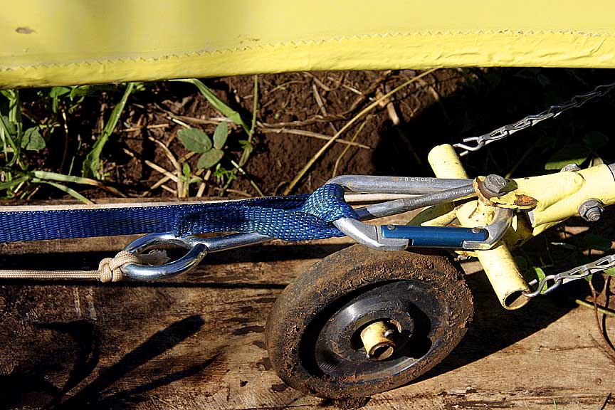 Shortly, there arrived a package from The Acme Gravity Catapult Co. (Beware of coyotes bearing gifts...). First, I dug out shallow pits for the main gear. This stopped the plane from rolling with the engine off... Next I drove a fence post three feet aft of the rudder. Hooking a blue nylon strap to the post, I looped the other end of the strap through a carabineer hooked to the tail wheel and jammed the loop with a large metal pin. Next, I tied a white nylon line to the pin, then ran the line back to the fence post, around a pulley, and then forward to the cockpit via a piece of PVC pipe nailed to the ground. (Thank-you Mr.Goldberg)