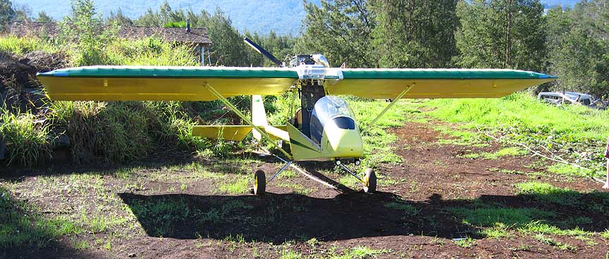 Pueo Field has been carved out of a sloping forest 2,700 ft. up the side of Haleakala (10,000 ft.). It uses the "Air America" lay out... take-off downhill (runway 29), land uphill (runway 11). I've paced out 350 ft. of lumpy hillside runway, 50ft. wide at the bottom down to 30 ft. at the top. The trees that surround it are about 40 ft tall, but no worries, this is Maui... so come the rainy season and with a little fertilizer and we'll have 'em up to the regulation "50 foot obstacle at end of runway" faster than you can spell FAA...