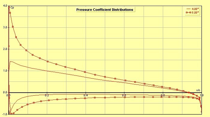 The inline attachment (if it transmits OK) shows an aerodynamic code's results for a typical light plane airfoil at a typical higher speed flight and lower speed flight -- A NACA 2412 at 4 degrees (smooth line) and 8 degrees (line with boxes) angle of attack relative to the chord line.