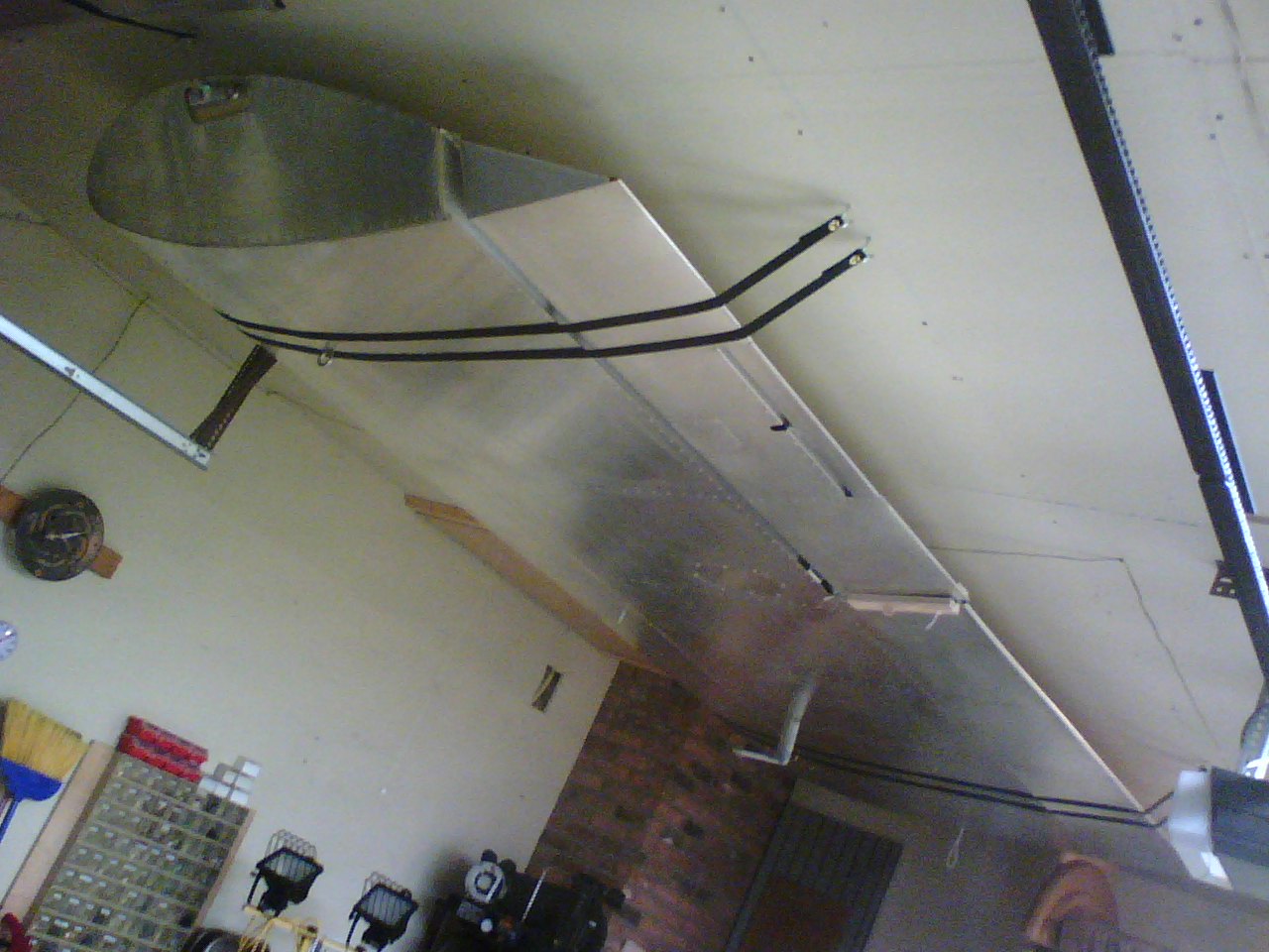 You guys have all found good solutions to the storage issue. In my case, I'm hanging them from the rafters in my hangar (at home) using lengths of rejected seatbelt webbing. I hung them nose up with wood blocks set in the rear spar channel to distribute the forces.