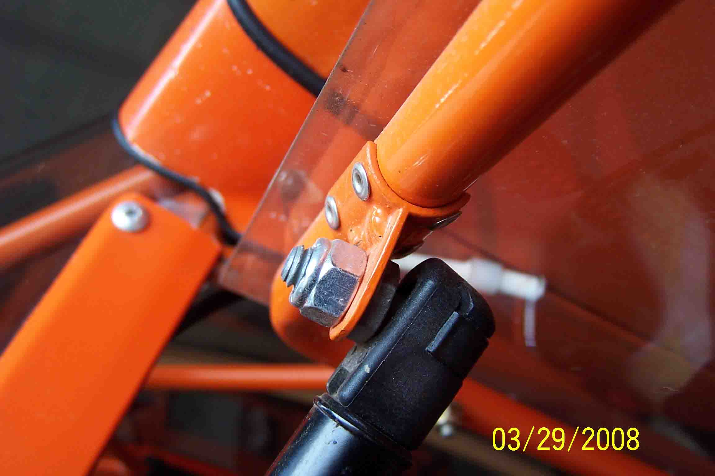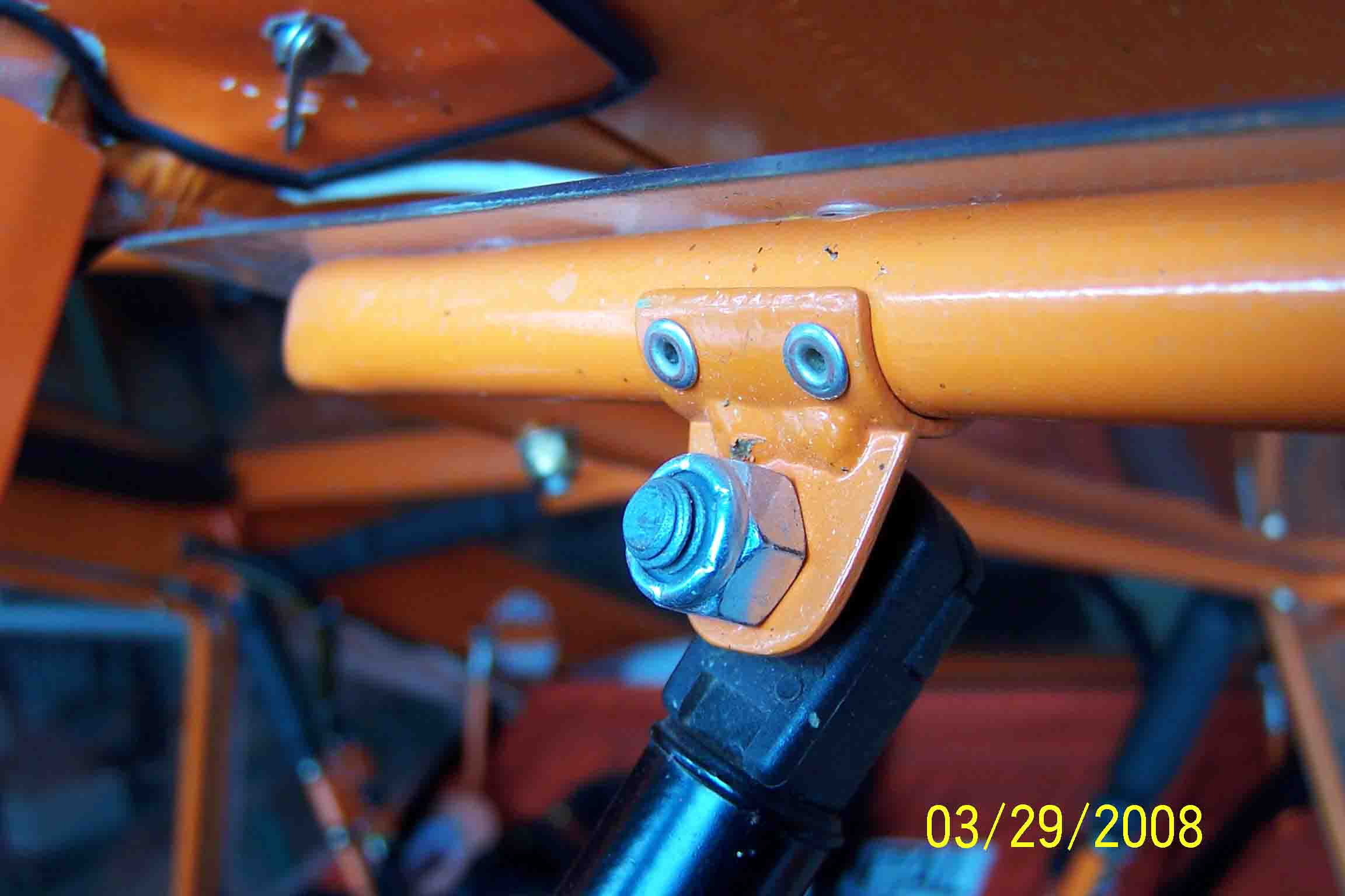 This is right beside the seat... A piece of angle turned into a bracket and held to the frame behind the seat with worm gear clamps. I did have to cur small holes in the back of the seat. The strut is outboard enough to give an over centre situation to help keep the door closed.