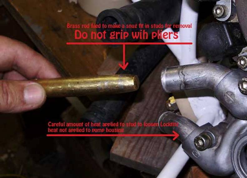 I made a tool out of a piece of brass round stock to assist removing the nipples from the pump top plate. A careful amount of heat was applied to the nipple only to break the Locktite. Slow and easy using minimum heat to avoid cracking or pinching the nipples. Green, penetrating Locktite will be used to reinstall the nipples in a direction that won’t interfere with the mount.