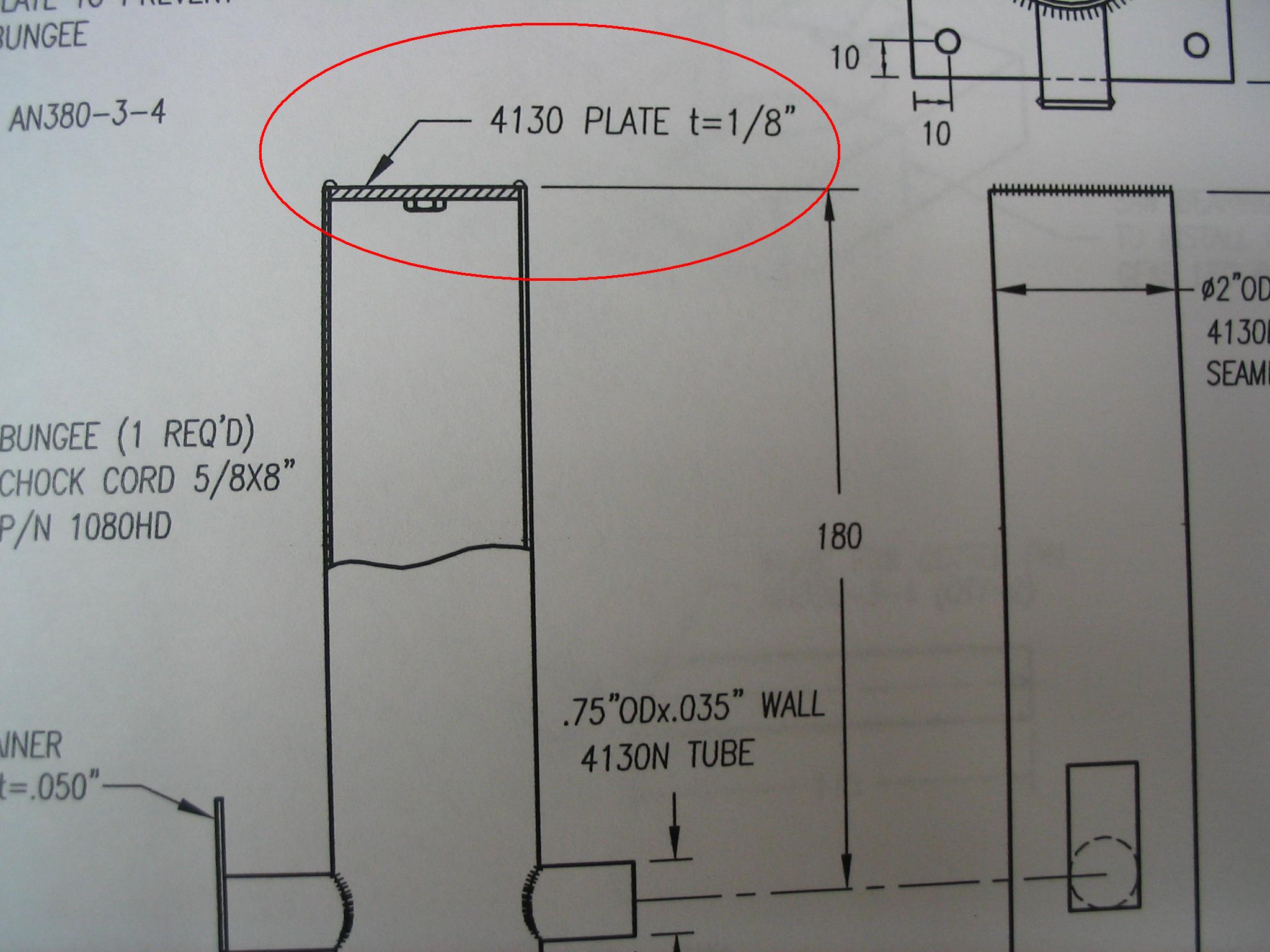 Drawing 6-G-1 shows that the Nose Gear Strut is capped with a welded 1/8" plate of 4130 steel (see picture).