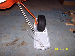 There are two wheels in tandem like a roller blade. I wanted only two wheels, otherwise one would not be able to turn the plane on pavement. Since these pictures I posted (taken in 2004), I purchased better wheels. The wheels I now have are 6" in diameter, and 2" wide. They are rounded so the profile is very small. As I stated earlier, the skis do very well in powder snow. I was at a grass strip with about 12" to 18" of tight powder snow, and the skis worked very well. I was off the ground in the same time as I would be on packed snow. When I shut down, I dug down into the snow to check how deep I sank and found that I went down about half the depth of snow (about 6" to 8" down). My prop was still well out of the snow. I made the skis a little tall because I wanted to keep the prop out of the snow as much as possible.