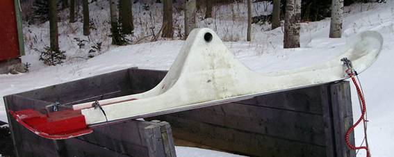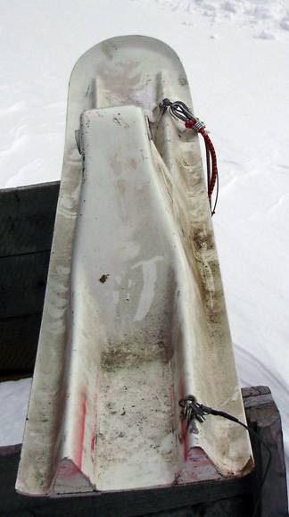 Picture 3. This angle shows the axel is straight and it also shows the two thin Teflon plastic runners on the bottom of the ski. Notice no whear bars as the skis are not to be used on bare pavement.