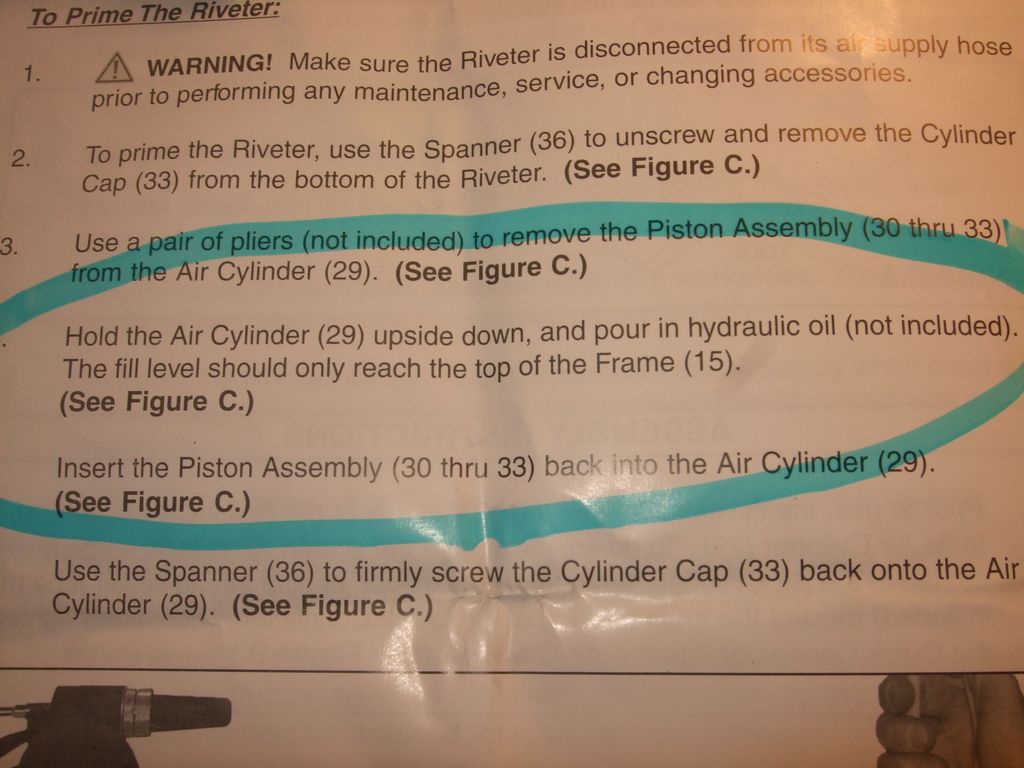 My second mistake was purchasing two guns so as not to have to continually swap out the two tips. As it stands, when I do get one of the (at)#$%&* things to work, it won't pull more then a dozen or so rivets, before me being obliged to open up the air cylinder and start fidgeting with the oil level again.