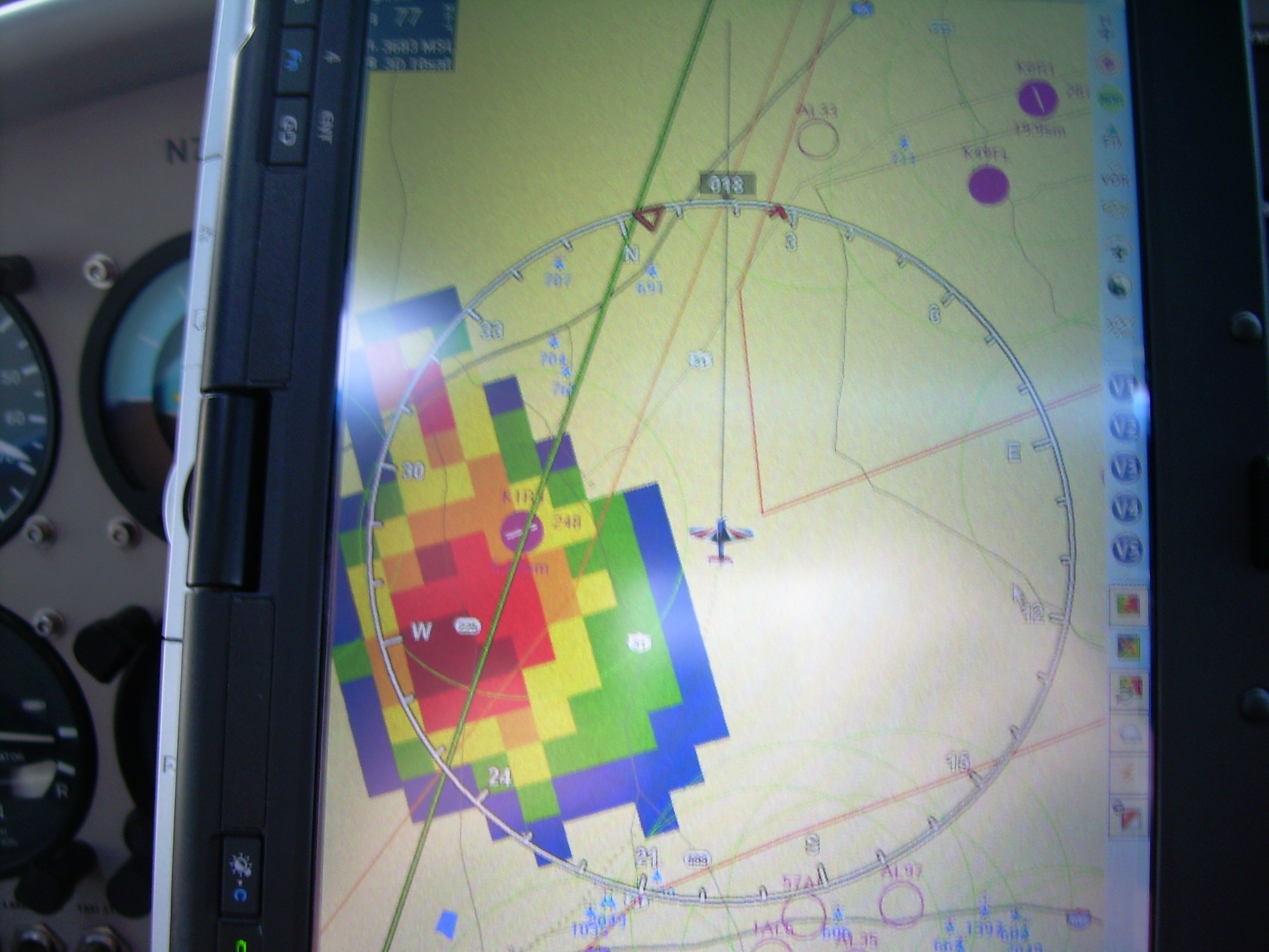 It wasn't too bad. I could tell when I hit the outflow because the air temp dropped about 7-10 degrees. Once that started it got a little rough. I could still see through the rain. I don't mind flying close to ugly weather as long as there is no active lightening. ...and again...I need to see through the rain! Also having the NexRad weather data "really" helps! To the right of my position, and just off the screen, was nothing but a wall of level 5 weather that was about 40 miles long...no where to go!