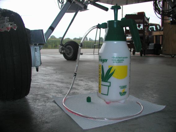 I tried to bleed the brakes with a little pump can like others have talked about doing. Well it made a big mess and did not work well. I asked a fellow RV builder (thanks Larry) about how he did it and found out from him that I could make a small pump sprayer into a pressurized brake bleeder. Here is how I made mine and it works great. It does take two people to do the job. I bought a 1-1/2 quart pump sprayer from Lowes allow with three different size pieces of tubing I put the tubing together and zip tied them to help hold them together. I used a small plug that came out of an instrument to attach another short piece of tubing to use as an overflow line to hold on the reservoir so the extra brake fluid could be caught in a bottle. Now this is the to do this job! When the job is all done the tubing can be stored in the tank to keep from losing it.