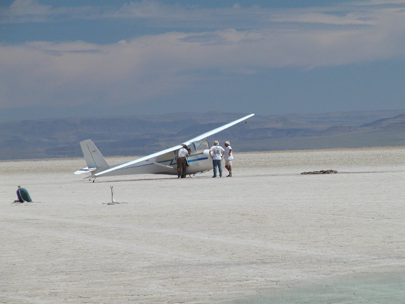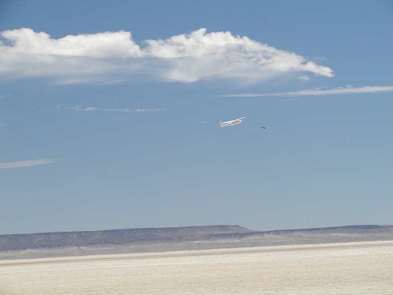 We decided to drive up to the entrance to the lake bed and son of a gun, there were gliders on the lake. I asked the wife what they were and she foolishly said " go see". It turns out it was a glider club from the Willamette Valley. (400 miles north by road) So I introduced my self and asked questions about the planes, where upon they asked me if I would like a flight? Naturally I took them up on it, leaving the wife and the dogs in the truck. Surprisingly even at 90 degrees oat. there was no thermals, which was just as well since it made it a lot easier to get back on the ground quickly. The glider was a trainer and not one of the more efficient types of single place ones, but the glide was still pretty impressive when one is used to a Firestar with a 8 to one glide rate. The performance was a lot similar though, stall at 40 mph ( mine is lower) landing speed is 50 mph, but man the air brakes and skid on the nose are serious. It was fun, but I will stick with a motor and the firestar.