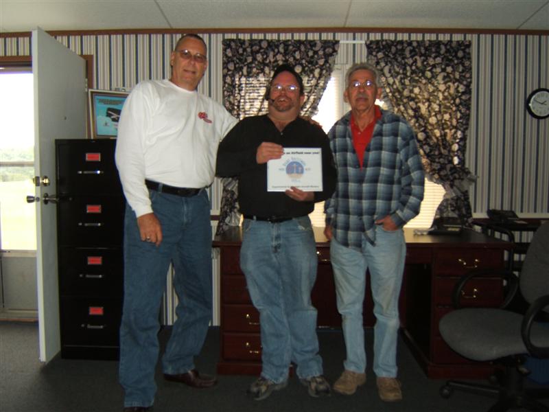 I and a friend got there, ate all the sasauge, biskets and gravy, flew several Kolbs, including the "yeller one", Met a man from Flordia that is finishing his Mark III, Took pictures of Denny and Travis. Picked up a gap seal bracket. Left my old smashed roll bar, prayed for good weather and great flying, watched them mow the air filed, put up Kolb flags, watched the lawn (whops, air field) get rolled, measured a gap seal assembly and took these pictures.