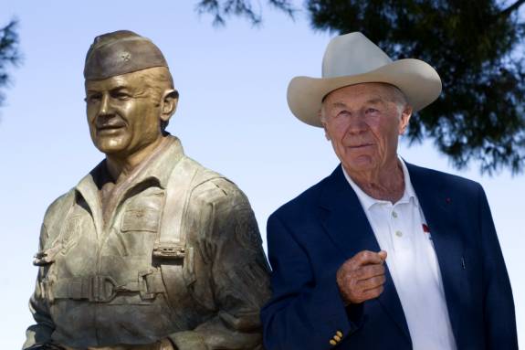The statue was dedicated in a ceremony at the corner of Rosamond and Yeager Blvd a street named in the General's honor. A dubious honor by Yeager's thinking: They name streets after dead people, he noted during his remarks.