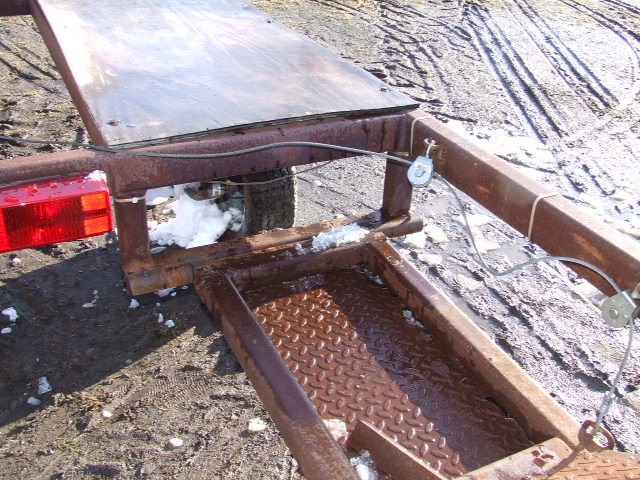 OK, Here's a view of what I call the "KEEPER WELL". Notice that the diamond plate is welded to THE UNDERSIDE of the support tubing. This is so it captures the wheels of the plane. As you crank the ramps up, the plane rolls into the wells. As you lower the plane, the wheels roll right out of the wells and down onto the ramps.Then you can roll it off the ramps to the ground.