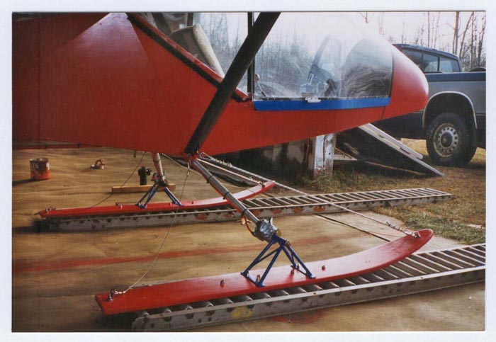 These are the skis I made for my Kolb. I made them out of old water skis that I had bought at a rummage sale for $10.00. I do not recommend making skis with metal bottoms because they will freeze to the ground.