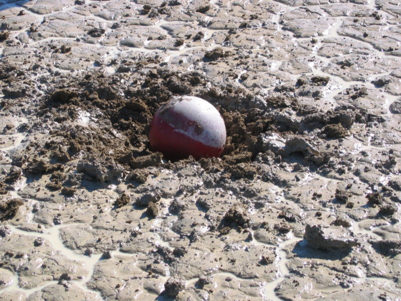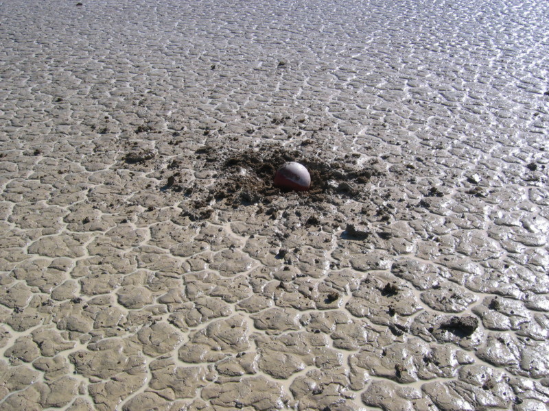 Here are a couple of pics of the ball and the splat-mark. It did far less than I had expected to the mud, but had a greater effect on the spectators than I anticipated. If I do it again it will be farther than 100yds from camp.