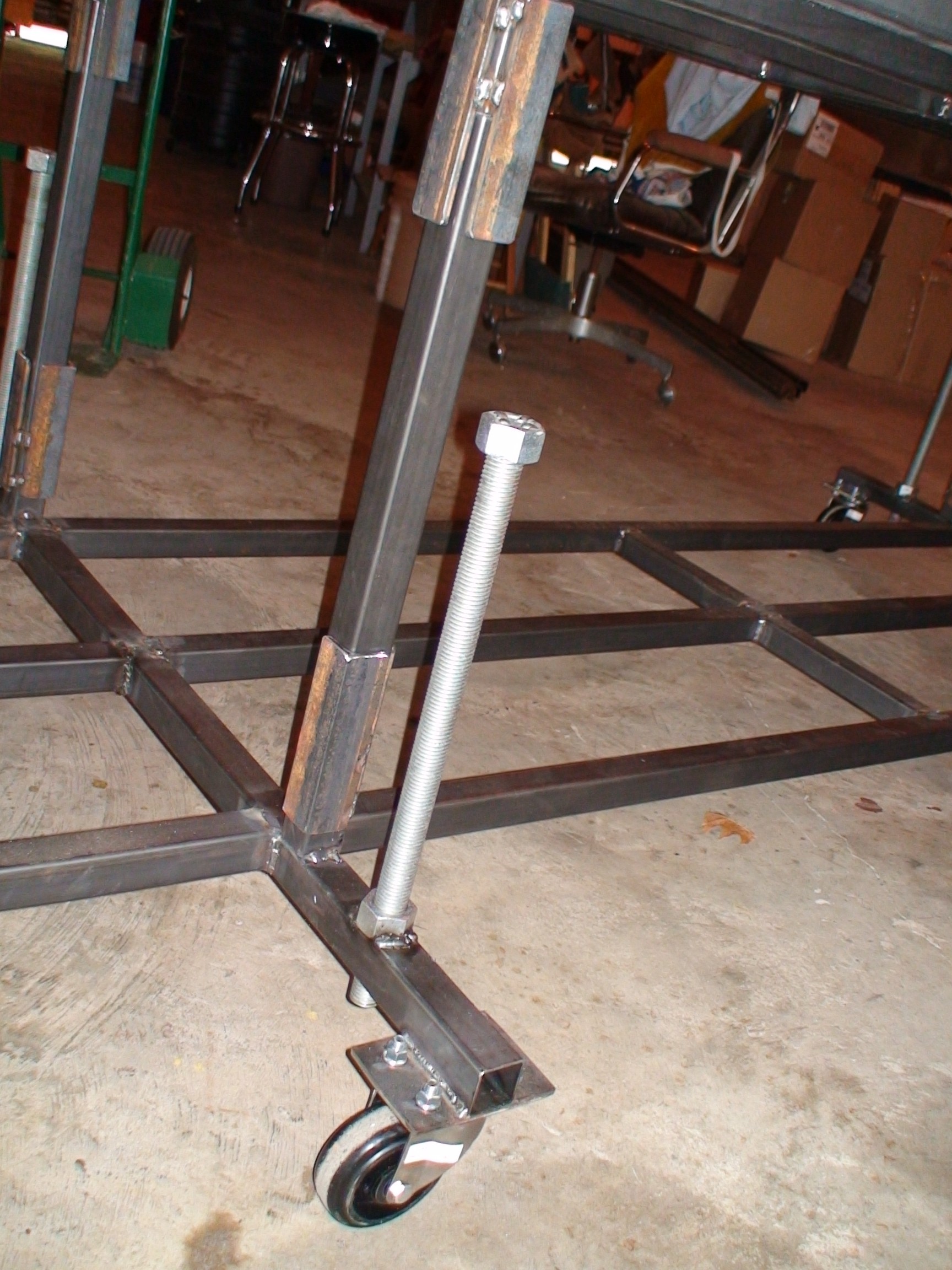Here are pictures of my finished table less wood top and paint. It is made out of 1.5 in steel tube and turned out level, flat and true. I finally settled on a leg socket arrangement made up of 1.5 in square tube 4 in long with two 6 in long 1.5 in angle iron welded to it.