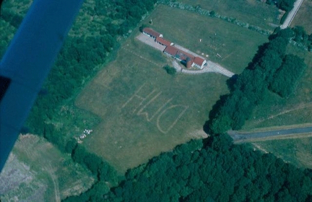 The year was 1977; I was 17 and the ink was barely dry on my new PPL when I rented a Cessna from the old Ramapo Valley Airport in NY and took my parents for a ride, when Dad took this picture... we flew over the day camp where I was working for the summer (my first job). Part of my job was cutting the grass and I cut some of it a bit closer than strictly necessary (DMH is, of course, my initials). Fortunately the boss didn't notice it...