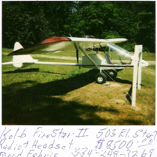 While I was finishing up some T&G's last Wednesday, there was a fellow there waiting for me as I shut down. He had recognized my Kolb MIIIC and had stopped. He mentioned that he had a Firestar II for sale. He doesn't have access to a computer and I told him I would post on the list. I do not know any of the details so: