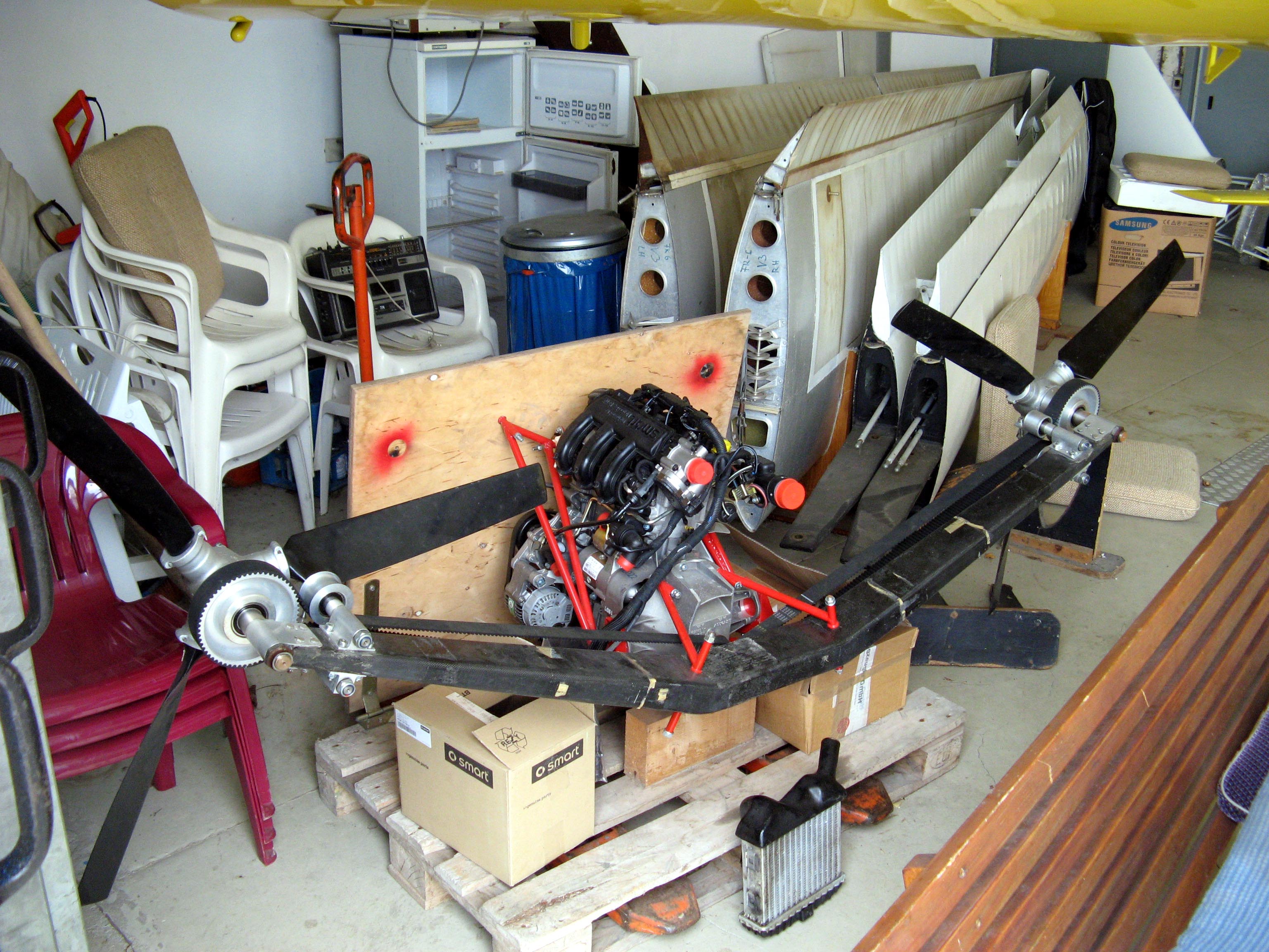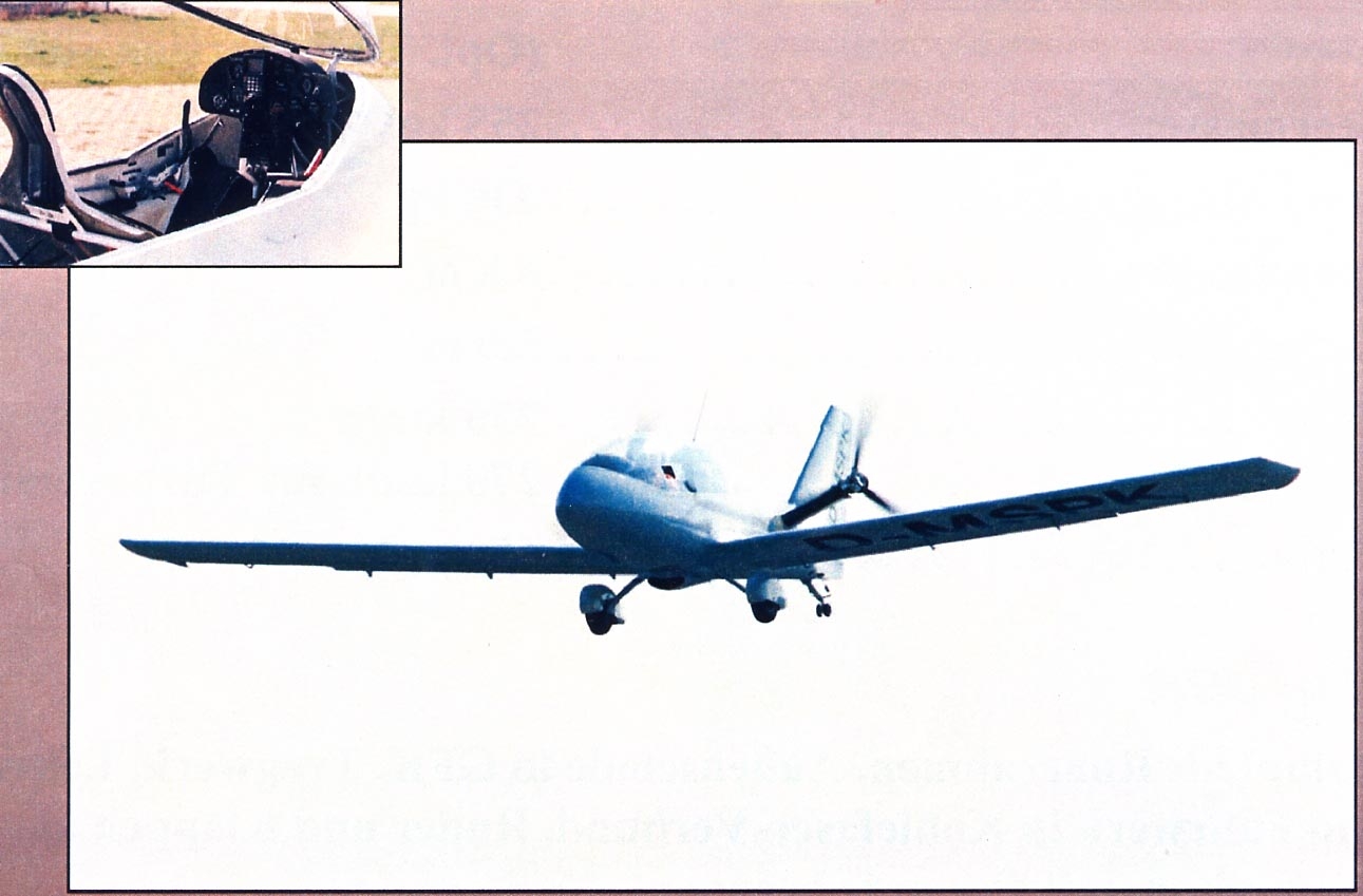 Slick BB got it ! The engine was developed from the 'smart' city car, a 700cc 3 cylinder turbocharged engine producing around 80HP at 5250 RPM with a 2.1 : 1 reduction belt drive and its quiet ! http://www.ecofly.de/english.htm