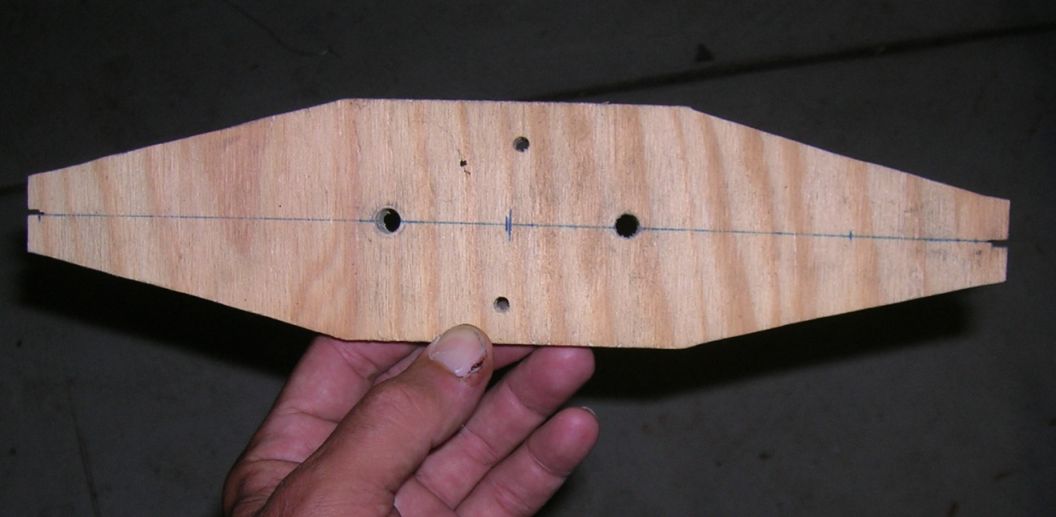 I made an attachment plate from a piece of scrap plywood. The two smaller holes at 90 degrees to the centerline were used to test an old Soarmaster prop from the olds when you had to foot launch ultralights. I used .032 safety wire to suspend the prop being tested from a piece of square steel tubing I "C" clamped from the hangar frame and braced the tube with a couple of pieces of steel flat stock I took from my scrap bin. The whole apparatus took about 15 minutes to make. I used the stop watch I bought for testing Vx and Vy speeds during phase 1 testing of my mk 3 and repeated the test 3 times and took the average time. About the hardest thing about it all was trying to eliminate as much of any extraneous side to side rocking as possible. With a little practice I got pretty good at eyeballing the center mark as being in the center of the twisting motion. Once you get it moving with the center mark as still as possible you can count 30 swings, write down the time, count 30 more, write down the second time and count 30 more. Like any pendulum, as the arc gets shorter the speed the arc slows down. In doing 95 to 100 total swings to get three 30 swing tests each set was within a few tenths of a second for each of the three. With mounting and dismounting, I tested five props in about an hour and a half, and that included a break to make a pot of coffee in the middle of the testing.