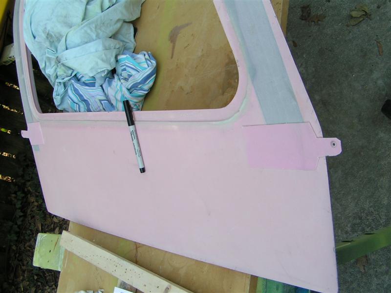 Here's a thought on the doors. Ours are pink and I didn't give it a whole lot of thought aligning them up prior to gluing -- the forward hole in the ear just below the windshield junction seemed to work just fine as a starting point.
