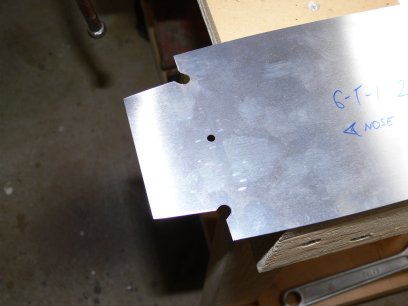While drilling the flange relief holes on the stabilizer centre ribs (6-T-1C) I made an error and drilled them too far out... no problem, just elongate the holes with a round file and bring them in. That went okay, but as I did them all together clamped in the cutting blocks, some of them were opened out a bit far. So instead of being 5/32" (half the 5/16" hole required) from the corner it's about 7/32" in the worst instance. See photo for what I'm on about.