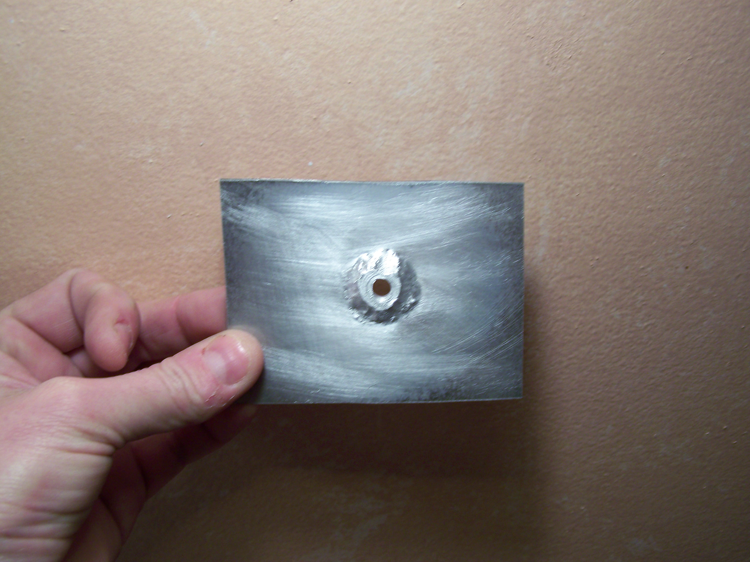 Tried a tank fitting. Fitting was about 3/4 inch diameter flange (now less) with a 1/2 shank, made it up on the lathe real quick and drilled a half inch hole in the .032 sheet. Next time I'll put even more flux on it and flux the back side. Actually not to bad though for a first try. Then I drilled the hole.