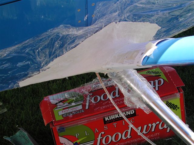 Ok, so now you start the fiberglass for the finished piece. Remember, the really nice surface is on the INSIDE of your layers of fiberglass, not the outside. But, let's continue. So if we put a few layers of fiberglass on the outside, and once it's cured, pull it apart. You will find you have something that is similar in shape as your build-up, but, boy, is the outside in rough shape. You will have to sand, and sand, and sand, on, and on. And I'm here to tell you, fiberglass impregnated with resin is darn near rock hard. Shaping after the fact is a living nightmare!!!! It will be the same process you just went through, making that "perfect shape" on your plane, only this time you won't be smoothing bondo, or joint compound, you be trying to smooth....well, glass!!!