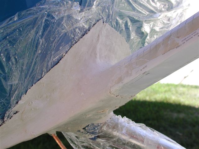 Another very big difference between the proper mold method, and the quick "lay on some fiberglass layers" method is weight. Think about it. If we make our sculptured shape flawless...on the plane...in position, and then make a thick rigid mold, whatever we build on the inside is going to be just as flawless (on its outer surface...the important surface). We can probably get away with as little as 2-3 coats of glass. This piece will be virtually perfect, needing only very minor and easy edge trimming. Lightly sand and then paint.
