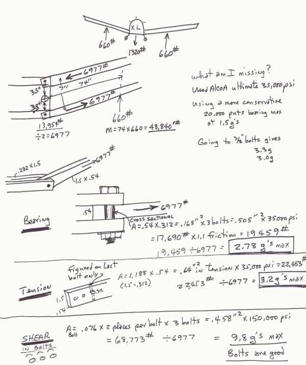 There are six bolts in there. I think you'd need to redo the analysis using the six bolts. I was going to get my Statics textbook out for this one myself, but I don't think this is a problem, albeit, I'd be damn sure to make sure those bolts were drilled right on the money AND reamed which it of course does call for. Even so, the NTSB never mentioned that joint failing. In fact, the folding occurred further outboard. I think that joint is fine, albeit pretty hairy looking at first glance.