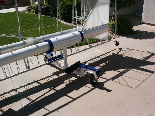 I made my wing support pads with the ability to "rock" a little, to allow for slight differences between the wing's and the pads. Another change I incorporated are little tabs on the back side of the main square tube, to allow for a tow bar. My intention, eventually, is to actually tow the plane , fully assembled, to my local airport. At least, that's the plan...we'll see. The entire cost of this version of my boom support was very close to $75, and about 2 1/2 days to build.