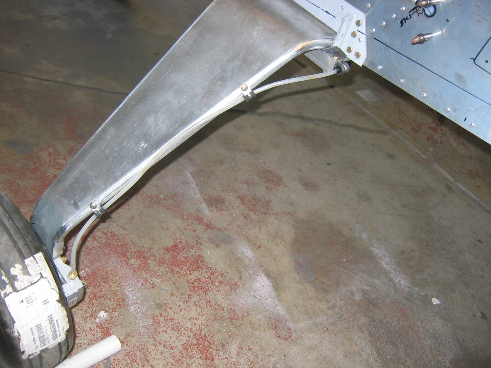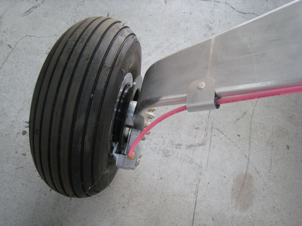 Here is my solution for the brake line routing on the landing gear. It is a small fairing I made that includes little brackets which hold the brake line in place. I routed the lines along the cabin bottom from the front to the area you see in the picture and held it in place with a couple of standard clamps.