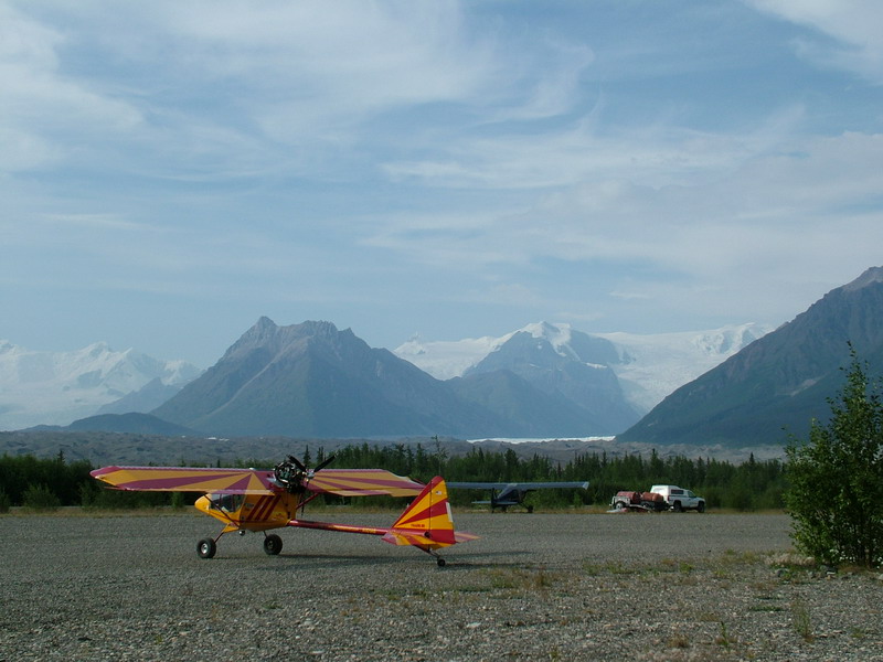 Gang: Here's a photo I took same day the video at Eureka Lodge was taken. This was at the new airstrip at McCarthy, Alaska, and Kennecott Copper Mine. It is a beautiful area at the end of the line. One of the reasons I like this photo is the Super Cub and gear of an outfitter or miner on the other side of the strip. I probably had enough fuel to get back to the Knik River, but don't like to take chances with fuel. Struck up a conversation of a fella that was flying one of the tour aircraft out of McCarthy. There was no fuel for sale for the public, but he bent the rules and sold me 10 gals out of their company tank. This fuel is haued in to the airstrip during the winter with the river is frozen. From McCarthy I flew back to Eureka Lodge with one stop in a borrow pit near the highway for a "pit stop". The Lodge closes the kitchen at 2200 and I was pushing hard to get there in time for some good food.